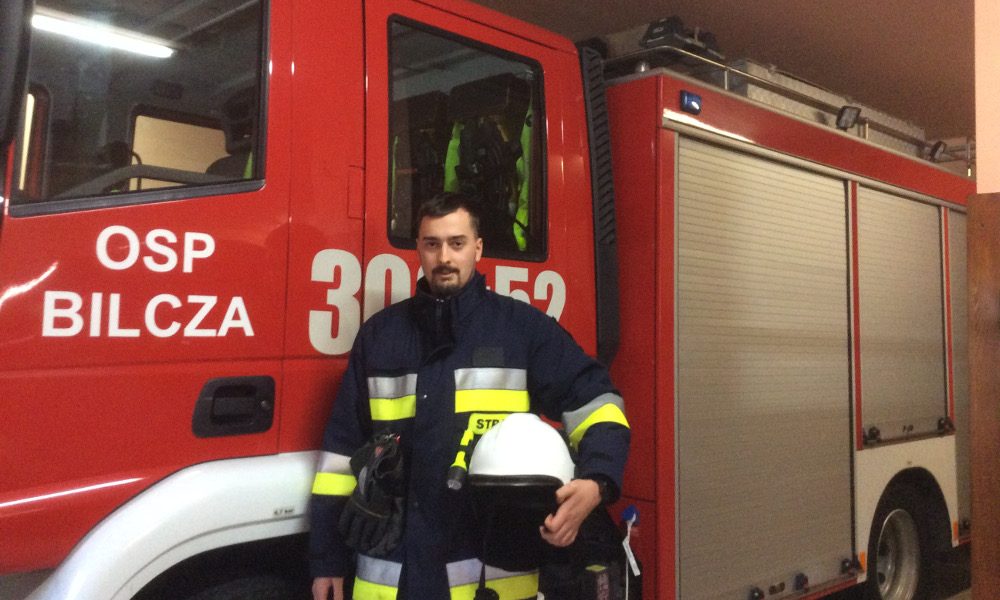 Od 4 lat należę do Ochotniczej Straży Pożarnej w mojej rodzinnej miejscowości – Bilcza pod Kielcami, a w zeszłym roku ukończyłem podstawowy kurs strażaka OSP. Dzięki niemu mam m. in. możliwość pełnoprawnego wyjazdu do zdarzeń. Żeby lepiej przybliżyć Wam historię chciałbym cofnąć się kilka lat wstecz. Wychowałem się w mieście i moja wiedza na temat straży była znikoma. Muszę przyznać, że Ochotnicza Straż nie kojarzyła mi się zbyt dobrze, a wszystkie pozytywne odczucia związane ze strażą, łączyłem z Państwową Strażą Pożarną, natomiast OSP widziałem bardziej jako jednostkę reprezentacyjną, a nie bojową. Moje skojarzenia były absolutnie błędne! Wszystko się zmieniło od przeprowadzki i nawiązania nowych znajomości. Okazało się, że niektórzy z moich przyjaciół należą do OSP Bilcza i niemalże od razu zarazili mnie swoim zaangażowaniem i entuzjazmem do służby. Dźwięk syreny i nowoczesny system powiadamiania (alarm w telefonie) oznacza przerwanie wszystkich czynności i jak najszybsze przetransportowanie się do remizy, aby wziąć udział w zdarzeniu.
