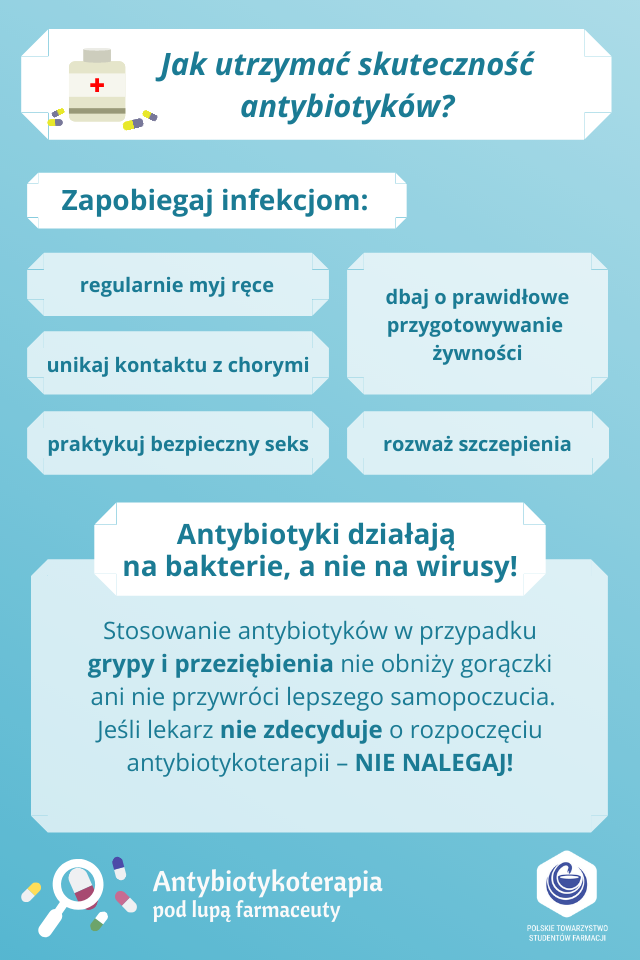 Ilość informacji potrafi być przytłaczająca, a pacjent może czuć się zagubiony. Dlatego ważne jest, aby farmaceuci i lekarze informowali o objawach i przebiegu poszczególnych schorzeń. Także studenci farmacji, którzy należą do PTSF, wyszli naprzeciw temu problemowi. Po raz kolejny zorganizowali akcję: „Antybiotykoterapia pod lupą Farmaceuty”. W swoim przedsięwzięciu zwrócili uwagę na problem narastającej antybiotykooporności. Członkowie PTSF przeprowadzili prelekcje dotyczące prawidłowej i racjonalnej antybiotykoterapii oraz poinformowali, o czym pamiętać, a czego unikać w trakcie leczenia. Dla przyszłych farmaceutów to także ciekawe doświadczenie, gdyż mogli nauczyć się, jak w przystępny sposób dzielić się wiedzą z pacjentami.